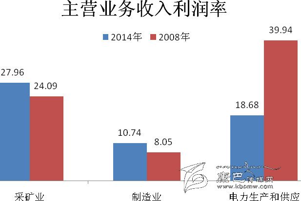 2013年,規(guī)模以上工業(yè)企業(yè)法人單位總資產(chǎn)貢獻率為8.46%,比2008年下降4.56個百分點。主營業(yè)務收入利潤率為18.83%,比2008年下降11.12個百分點。其中,采礦業(yè)為27.96%,比2008年上升3.87個百分點;制造業(yè)為10.74%,比2008年上升2.69個百分點;電力、熱力、燃氣及水生產(chǎn)和供應業(yè)為18.68%,比2008年下降21.26 個百分點(詳見表2-4)。