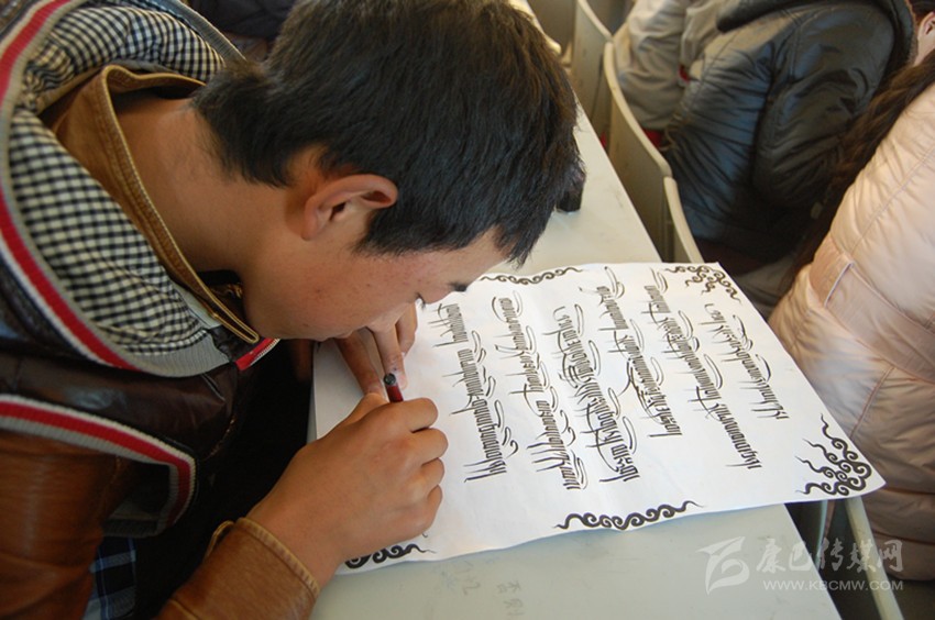 學(xué)生正在學(xué)習(xí)藏文書法。