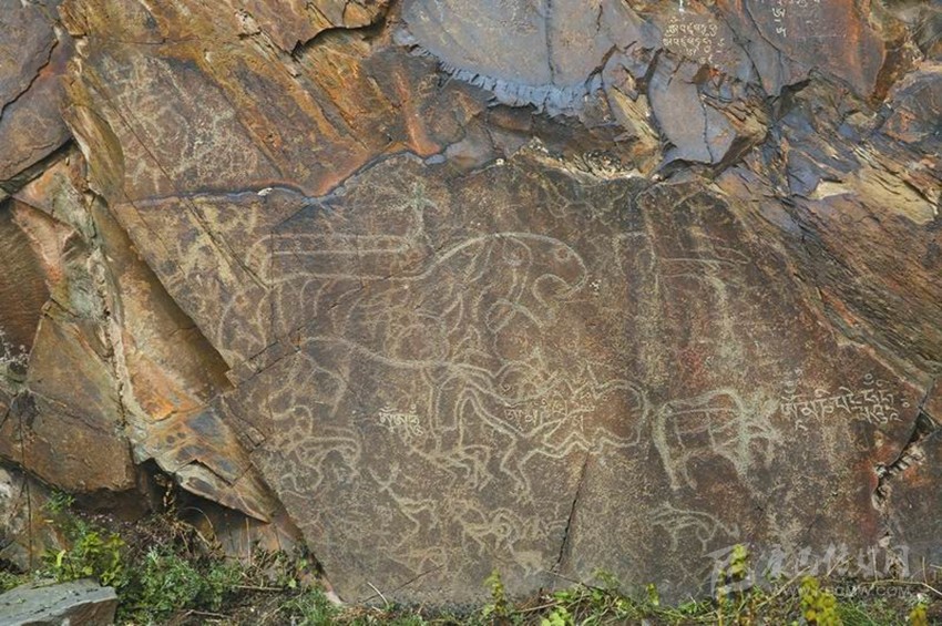 省考古院李飛介紹,其中一處巖畫(huà)上,還能看到古藏文的題記。這些圖像均為密點(diǎn)鑿刻,創(chuàng)作者先用細(xì)線在崖壁上刻劃出輪廓,再通過(guò)密點(diǎn)敲鑿出圖像。它們中,有的是通體剪影式,有的則是粗線條輪廓式。