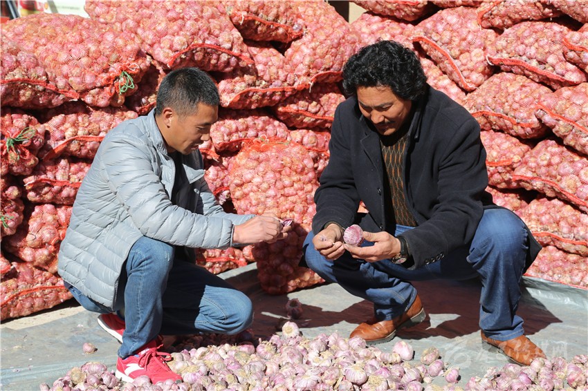 為保障村民的積極性和利益,八埡村積極協(xié)調(diào)村民們成立專業(yè)合作社,并與外地商戶簽訂收購協(xié)議,合作社負(fù)責(zé)從農(nóng)戶收購大蒜運(yùn)往協(xié)議收購商家。種植戶擁珍志瑪看著自己收獲的大蒜說:“今年我家種了2畝多,合作社直接到地頭收購,這讓我們省了不少心”。
