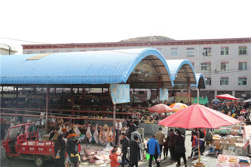 走進(jìn)康北農(nóng)貿(mào)市場(chǎng),筆者看到,一捆捆新鮮的綠色蔬菜、一塊塊剛剛宰好的牦牛肉、一箱箱水果整齊地?cái)[放在臺(tái)案上吸引著過往農(nóng)牧民群眾的眼球。不大的市場(chǎng)里熱鬧非凡,大家有人正忙著選購牛肉、水果和糖等年貨,有人正把一箱箱包裝好的年貨往車上搬運(yùn)。