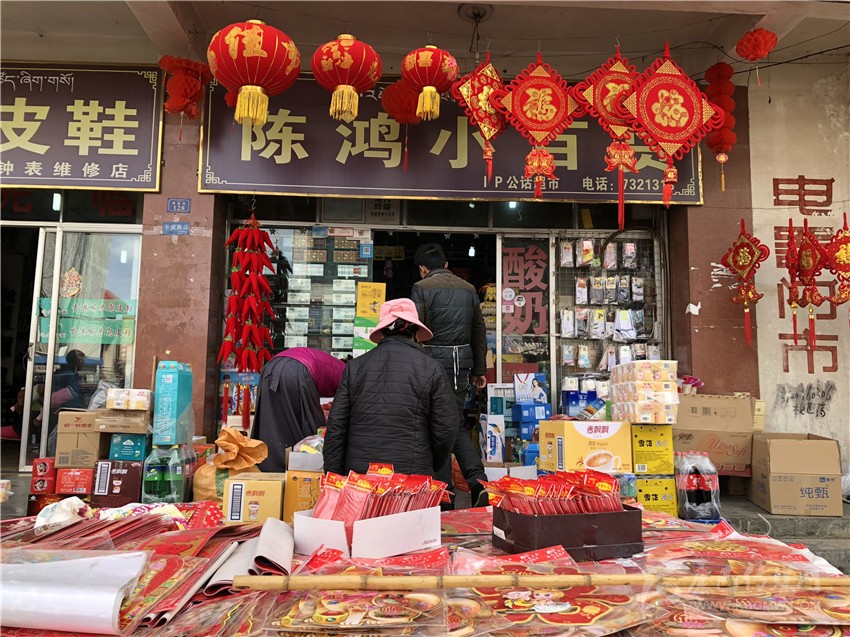 新都鎮(zhèn)格色村的丹真大哥和老伴兒其吉牽著8歲的孫子正在干果店里挑選各類干果,身后的背簍里水果、蔬菜、酥油、牛肉等農(nóng)畜產(chǎn)品以及中國結(jié)、年畫、對(duì)聯(lián)、掛圖等吉祥的節(jié)日物品應(yīng)有盡有。