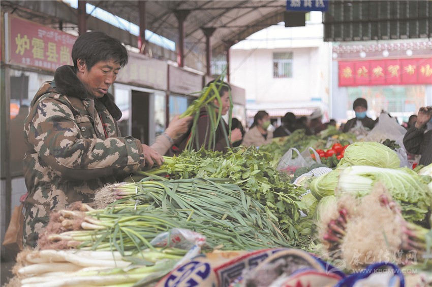 農(nóng)貿(mào)市場(chǎng)貨源充足,市民正在采購蔬菜。