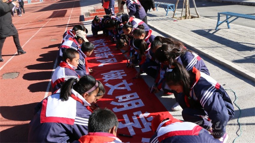 巴塘縣金弦子小學(xué)學(xué)生在文明禮儀橫幅上簽字。