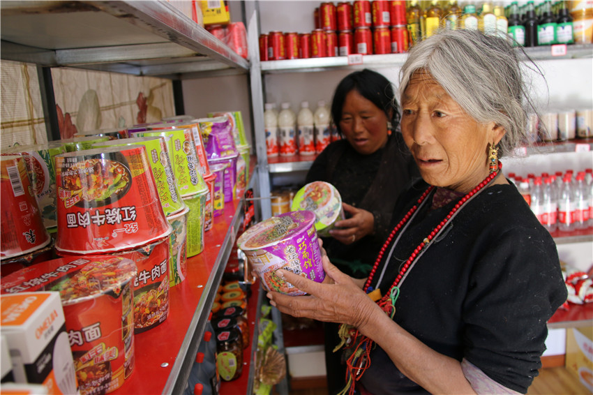 貨架上的貨物琳瑯滿目,價格與縣城大超市一分不差,還節(jié)省了路途奔波?!凹议T口就能買到東西,還又好又便宜,安逸。開展精準扶貧,硬是為大家解決了大困難?!?村民格瑪拉措道出了村民們的感激。大家共同商議決定把這超市叫做“洛蝦村感恩超市”。
