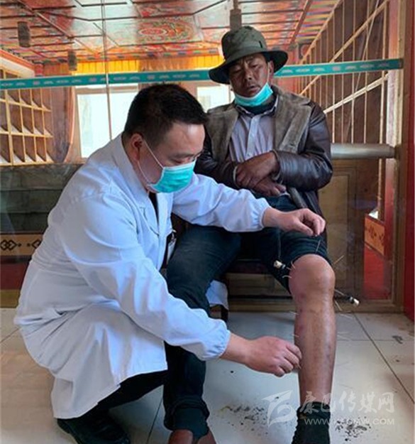 王利洪為藏族同胞看病。(王波 攝)