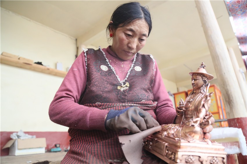 一雙粗糙而靈巧的手正一絲不茍地對銅像進(jìn)行最后的打磨。這是一雙執(zhí)著于銅鑄工藝43年的手。尼瑪從7歲開始學(xué)習(xí)銅鑄手藝,是該項(xiàng)工藝的州級非物質(zhì)文化傳承人。