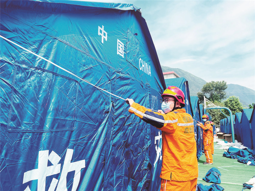 9月8日,當(dāng)救援隊伍陸續(xù)離開磨崗嶺村的時候,一頂頂藍(lán)色的帳篷已經(jīng)搭建完畢,村民們已經(jīng)全數(shù)搬進(jìn)救災(zāi)帳篷。記者獲悉,后續(xù)救援物資將通過被搶通的道路陸續(xù)運(yùn)抵村子。