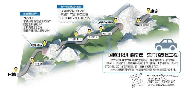 國道318川藏南線是四川進藏大通道之一,也是甘孜藏族自治州境內(nèi)極其重要的交通主干道之一。2011年啟動建設(shè)的東海路改建工程,按三級公路標(biāo)準(zhǔn)改建,起于甘孜州康定市新都橋鎮(zhèn)東俄洛村,翻越高爾寺山、剪子彎山、卡子拉山、托洛拉卡山四座海拔4000米以上高山,止于海子山,全長約275公里。