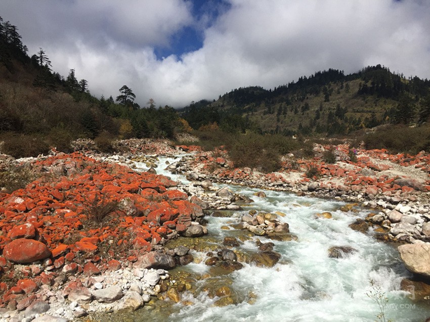 曾經(jīng)有科學家將海螺溝的紅石帶出去研究,結果剛下飛機,發(fā)現(xiàn)石頭上的紅色褪了,因為空氣質量不好,導致石頭上的喬利橘色藻無法生存。