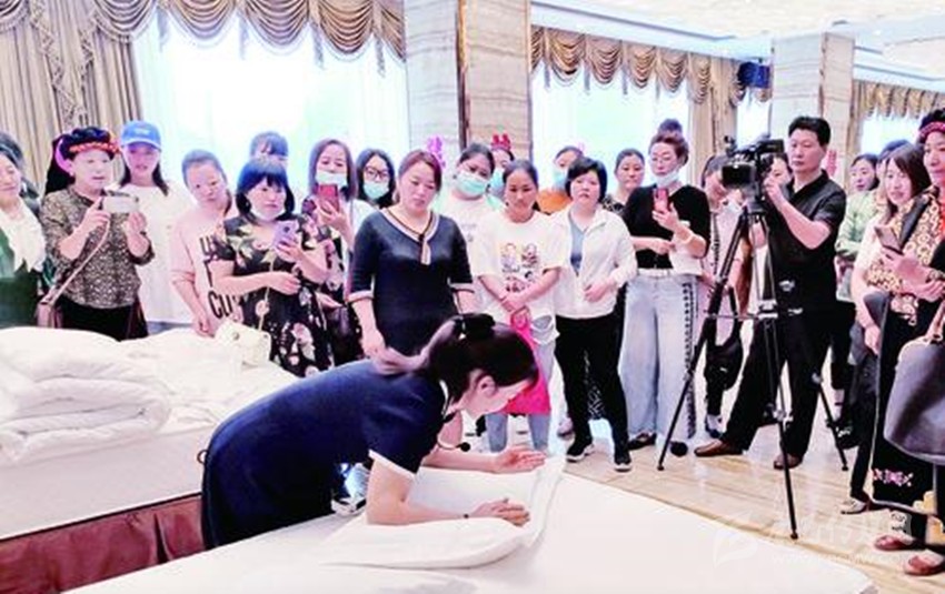 先檢查床箱與床墊是否吻合,床墊拉出40公分,鋪床前撣去床上毛發(fā),接下來(lái)開(kāi)始甩單,床單正面朝上,床單中線(xiàn)居中,兩邊吊邊均等,甩單動(dòng)作簡(jiǎn)單瀟灑,準(zhǔn)確到位。這是7月8日,稻城縣文旅行業(yè)從業(yè)人員培訓(xùn)會(huì)上,筆者見(jiàn)到學(xué)員在教師的指導(dǎo)下表演的精彩一幕。
