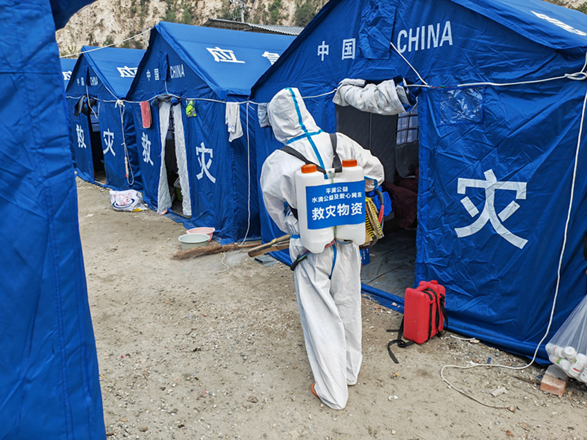 藏醫(yī)院醫(yī)務(wù)人員在地震災區(qū)進行消殺。