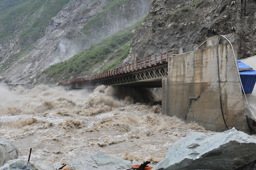 6月29日,恰逢周末,但在該公司的防汛指揮中心已是繁忙緊張氣氛,防汛值班員雖已熬紅了雙眼,緊盯著監(jiān)視屏并時刻保持與前方的聯(lián)系;7時23分,該公司副總經理杜三林,長河壩工程部、安全環(huán)保部相關負責人來到了指揮中心;8時,流量逼近4170立方米每秒;10時,流量超過4200立方米每秒,已超過該工程自2010年開工以來最大流量,整個指揮中心的氣氛變得隨之凝重起來;10時30分至11時,指揮中心接連收到施工單位電話險情報告:此時此刻,長河壩工程初期導流洞水勢兇猛,導流洞出口橋0號橋臺回填料淘刷嚴重,1號橋墩發(fā)生傾斜,橋梁隨時有傾覆的可能,將會危及下游圍堰高程最低的中水十四局、中水五局營地的安全,更將會危及到300余名員工的人身安全;金湯河突發(fā)特大洪水,沖垮了通往金湯土料場的場內公路,沿線山體已發(fā)生了小型泥石流,土料場通訊、交通已全部中斷,急需救援;持續(xù)降雨引發(fā)響水溝泥石流,3萬余立方米泥石流堆積物順溝而下,沖垮了響水溝石料場的鋼橋,并堵塞了場內12號路1號隧道。必須馬上清運疏通,否則,響水溝再發(fā)泥石流,長河壩上游圍堰和大壩填筑工作面將直接面臨泥石流堆積物的直接沖擊,險情萬分緊急!