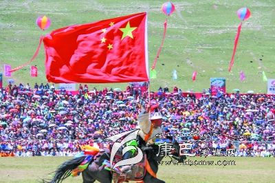 7月25日,第八屆康巴文化藝術(shù)節(jié)在玉樹藏族自治州開幕。數(shù)名參加開幕式的藏族老鄉(xiāng)高舉鮮艷的五星紅旗策馬狂奔,風馳電掣,跨越扎西科賽馬場,一瞬間,歡呼聲震耳欲聾,開幕式進入高潮。