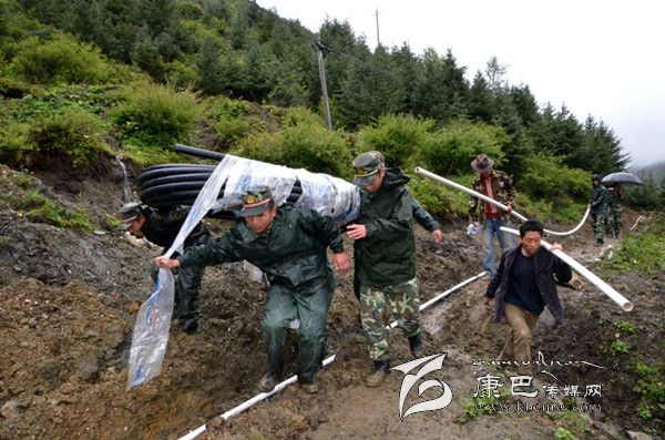 “非常感謝武警官兵!如果不是你們幫忙,我們的‘引水到村’計劃將一再推遲,影響村民的用水……”老榆林村村長項康玉感激地對官兵說。老榆林村原來的自來水飲用水源現(xiàn)已不夠用了,村民吃水面臨時斷時有的問題,為保證村民飲用水供應,由政府出資一部分,村民集資一部分,村里決定利用山頂常年的冰雪融水作為水源。前期,老榆林村已請工程隊挖好山頂至村子的2000余米的管線溝,由于連日陰雨,加之山高路險,鋪設管線工程的事一拖再拖,以致挖好的管線溝多處被雨水沖下的泥石填埋,嚴重影響飲水工程的竣工時間。村民們心里都很著急,但村里的年輕人大部分都外出打工,留守的大多是婦幼,抽不出勞力,村長項康玉無奈之下求助武警官兵。武警四川省總隊二支隊領(lǐng)導得知情況后,第一時間派出官兵投入老榆林村自來水管線鋪設工程。