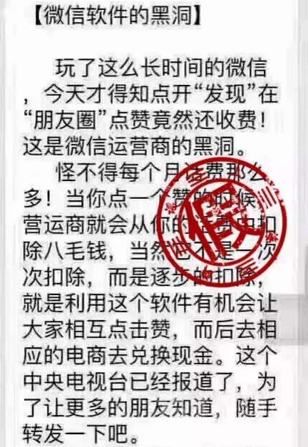 近日,微信群中流傳一條消息稱:“玩了這么長時間的微信,今天才得知點贊竟然還收費。當你點一個贊的時候,運營商就會從你的話費中扣除八毛錢……中央電視臺已經(jīng)報道了?!?/p>