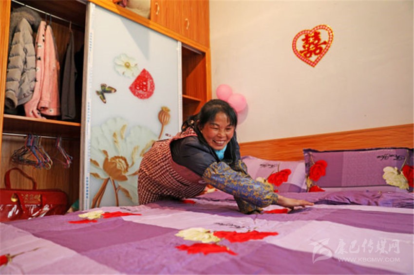 張進芬正在整理兒子兒媳的新房床鋪。王曦 攝