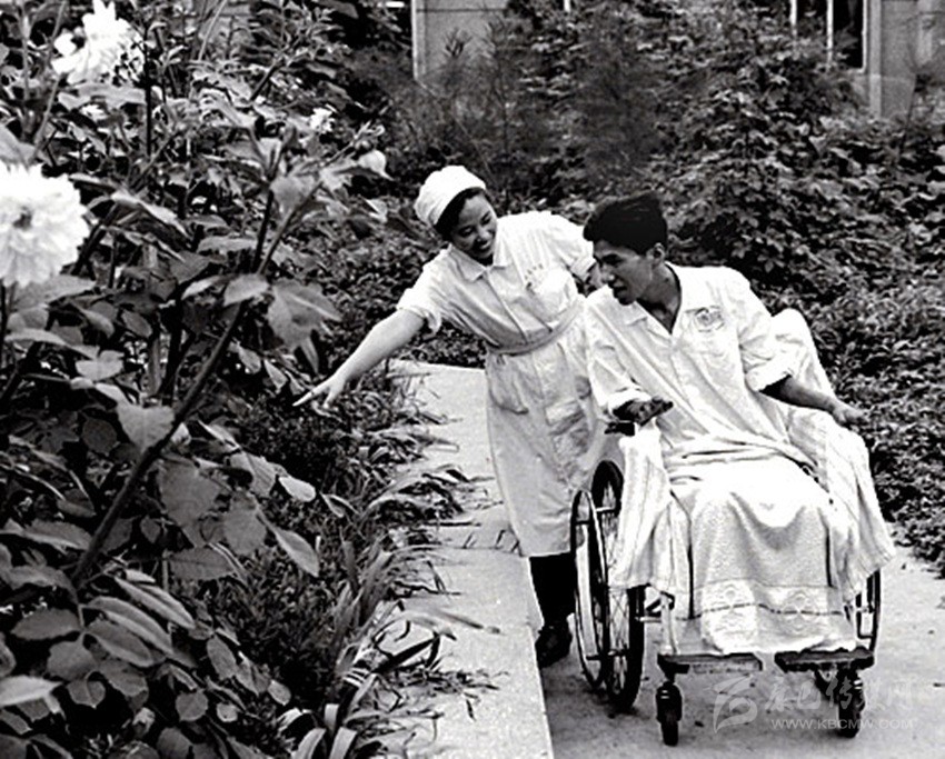 松田宏也在四川醫(yī)學(xué)院附屬醫(yī)院護(hù)士長陳克芳的護(hù)理下來到花園里。 資料圖片