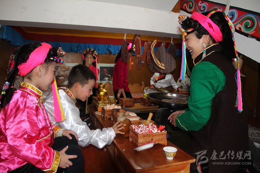 筆者正在參觀時(shí),老師帶領(lǐng)著一群可愛的孩童走進(jìn)鍋莊房內(nèi)。孩子們脫下鞋襪,盤膝坐在藏床上,一邊做著喝酥油茶的樣子,一邊唱起古老的嘉絨歌謠。稚嫩的嗓音中,遠(yuǎn)古文化煥發(fā)出新時(shí)期的獨(dú)特魅力。老師則坐在火籠邊,不斷地“忙碌”著。孩子們“吃飽喝足”后,走到房屋主人的扮演者老師面前鞠躬致謝,文明禮儀也得到了升華。
