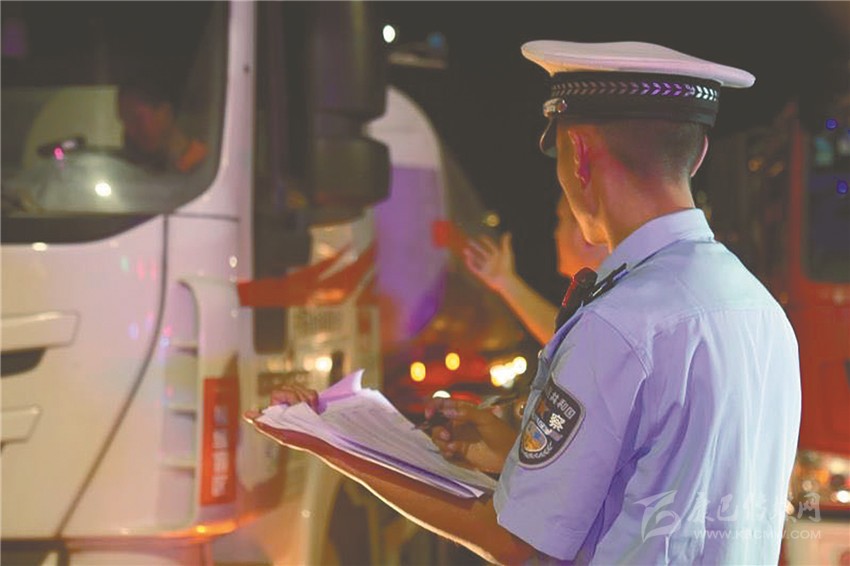 圖為交警現(xiàn)場(chǎng)核查車(chē)輛信息。