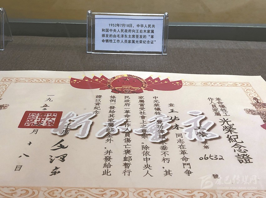 1952年7月18日,中華人民共和國中央人民政府向王右木家屬頒發(fā)的由毛澤東主席簽發(fā)的“革命犧牲工作人員家屬光榮紀(jì)念證”。 李睿 攝