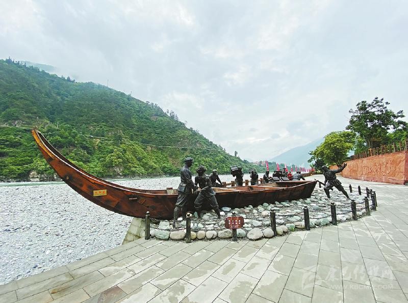 不遠(yuǎn)處的安順場(chǎng)渡口、大渡河邊,矗立著一座“紅軍渡”石碑,上面的三個(gè)鮮紅大字由渡河時(shí)任第一軍團(tuán)第一師一團(tuán)團(tuán)長(zhǎng)楊得志題寫(xiě)。石碑旁陳列著的一艘長(zhǎng)10.5米、寬2.3米、高2.2米的“紅軍船”,正是當(dāng)年紅軍強(qiáng)渡大渡河時(shí)使用的翹首木船復(fù)制品。木船旁,是戰(zhàn)士和當(dāng)?shù)卮兿蚰敬\(yùn)送武器裝備的雕像,斜坡上,勇士隊(duì)伍正奔向渡口。