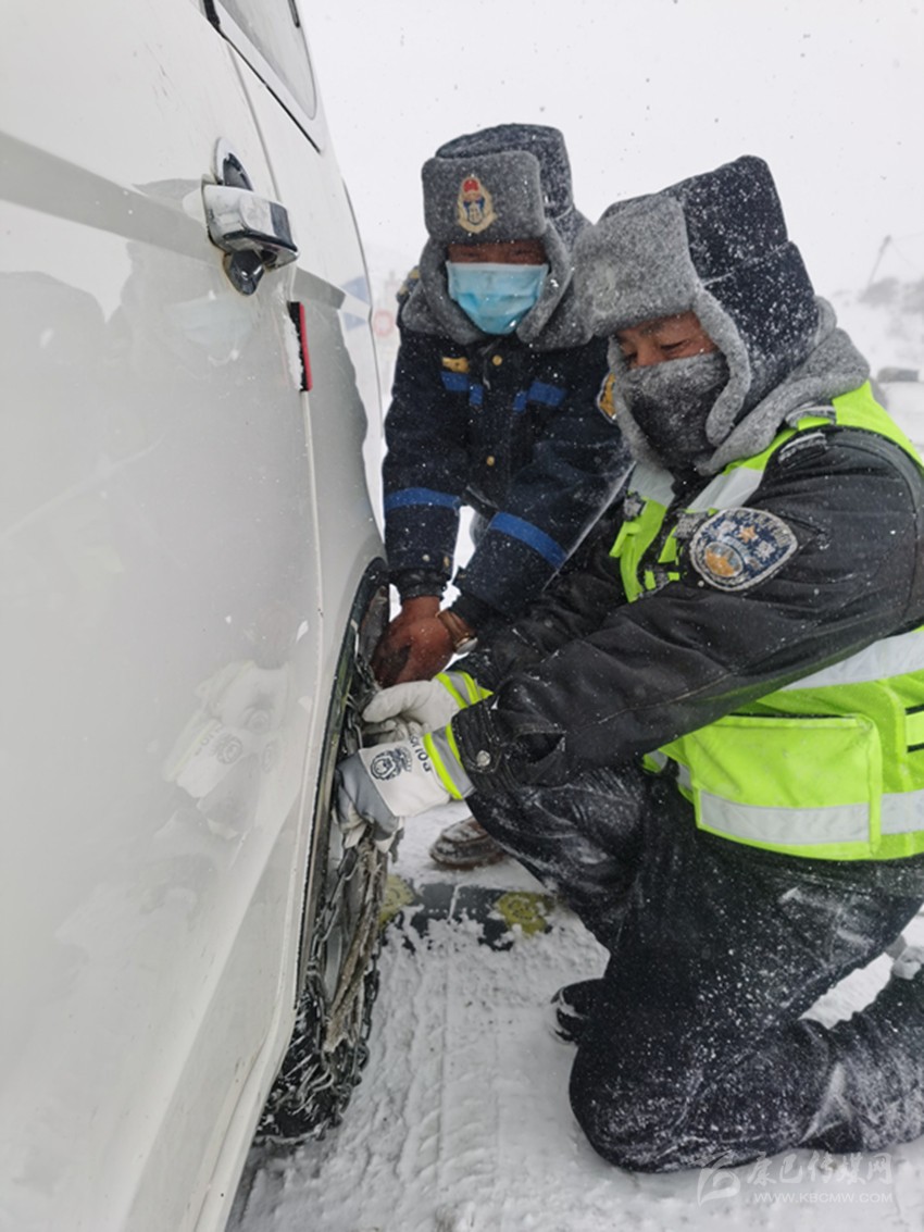 圖為錯阿卡點(diǎn)民警幫助過往車輛安裝防滑鏈。