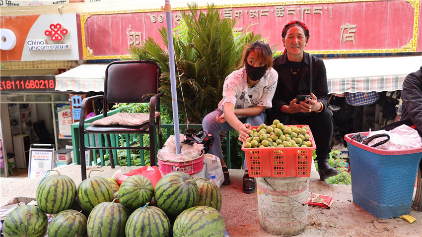 6月27日早晨8點,位于得榮縣城內(nèi)的太陽谷鎮(zhèn)平安農(nóng)貿(mào)市場熱鬧非凡,得榮縣特色農(nóng)產(chǎn)品銷售點23個具有民族特色的攤點臨街一字擺開,琳瑯滿目的地方特產(chǎn)吸引著大家的目光,問候聲、叫賣聲、詢價聲,聲聲入耳;買到心儀商品的愜意、賣上好價格的喜悅、了解商品行情的滿足,相互交織,充滿人間煙火氣。