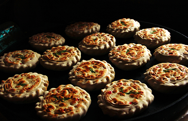 印板圖案多為三條圓圈或藏族美術(shù)中常有的萬吉祥等,圈內(nèi)雕有玉兔、鹿子、獐子吉祥物等,一般是一對玉兔相對而立,或是鹿子休閑躺于青草之上,或是兩朵鮮花對開,或是……再用手將“花饃饃”的周邊勒成各種花邊,并點上幾點食用紅點(紅點表喜慶,如年內(nèi)曾遇喪事則不點紅點)。最后將成形的“花饃饃”置于平鍋底在火上炕成即可。炕好后的“花饃饃”外形呈圓形,象征圓月,“圓月”里有玉兔等吉祥圖,有象征喜慶吉祥的紅,有象征春天的綠,極為鮮麗好看而又香甜味美,叫人垂涎。但做好后不能立即實用,首先要選兩個最大最好的來敬月亮,敬菩薩,要等敬月亮,敬菩薩后,中秋這天才能吃,并伴以水果等物贈送鄰里、親朋。據(jù)說這是為了促進友誼,讓大家品嘗大家吉祥。