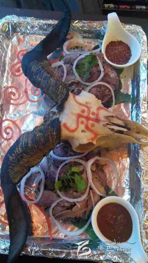 當(dāng)葩姆名卡的主廚把“吉祥羊頭”端上餐桌時(shí),記者首先被它大氣的擺盤所吸引,一只被剝得光光的羊頭放在盤子中間,上面用番茄醬畫上了藏族寓意吉祥的圖案。被剃下來的羊肉分成兩邊擺放在兩只羊角下,上面用洋蔥和香菜做了裝飾。為了減少羊肉帶給食客的油膩感覺,在羊肉堆下還另有乾坤,用青菜腌制的咸菜藏在下面,一口羊肉一口咸菜,很是爽口。