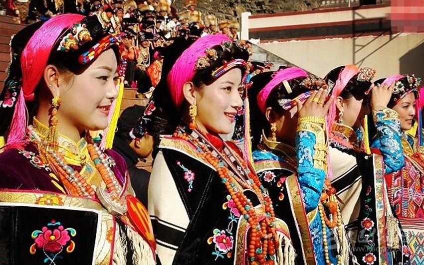 女性頭戴“巴惹”(即頭帕)、四周繡有彩色絲邊圖案。姑娘的頭帕均有花繡,邊角垂吊有花穗、梳發(fā)辮,中年以上婦女一般不繡花。上身穿長套裝,外著肩披,腰著百褶裙,穿靴子。發(fā)辮上穿戴銀飾中嵌有珊瑚、綠松石等珠寶的頭箍。項鏈多為珠寶和“嘎烏”,佩戴銀質(zhì)珠寶鑲嵌的耳垂和戒指,手鐲多為象牙圈和銀鐲。腰兩側(cè)懸吊銀垂鈴,行走時有一片銀鈴聲,清脆悅耳。男人頭戴金氈帽、狐皮帽或博士帽,外著長套裝(褚巴),頂掛珊瑚珠串,束腰帶,佩腰刀,胸掛“嘎烏”,手戴戒指、手鐲、腳穿藏靴,顯得華貴、富有和莊重。