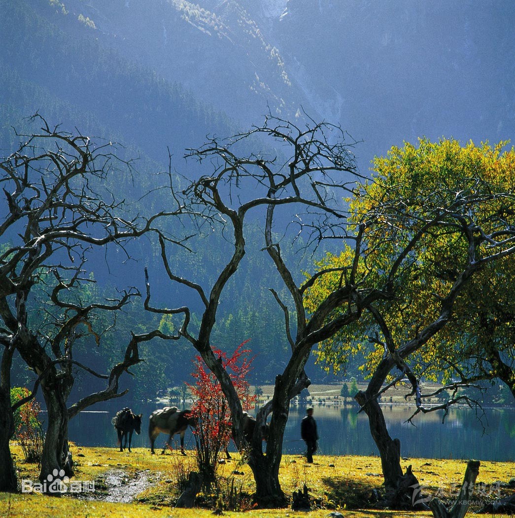 伍須海,湖面海拔3760m,長約1200m,寬為600m,最深處達(dá)33m。湖水由冰雪融水和地下水供給,東南泄入伍須溝,匯至九龍河。在伍須海的南北聳立著兩座梳子形的山峰,巍峨壯觀,西方是浪古則雪山,東南邊至朗加達(dá)卡山梁,南距伍須鋪?zhàn)邮歉骶咝螒B(tài)十二姊妹峰。美麗的伍須海幽靜而神奇,完全保持著原始生態(tài)。